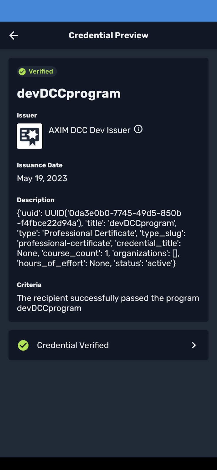 Recently we shipped the first increment of support for verifiable credentials on the Open edX platform. The first increment allows learners to share program credentials to wallets that support two data models, Verifiable Credentials Data Model v1.1 and the Open Badges Specification v3.0. Our testing and development targeted sharing credential via the Learner Credentials Wallet, an application for iOS and Android phones, created by the Digital Credentials Consortium. The Learner Credentials Wallet supports storing credentials using both data models.