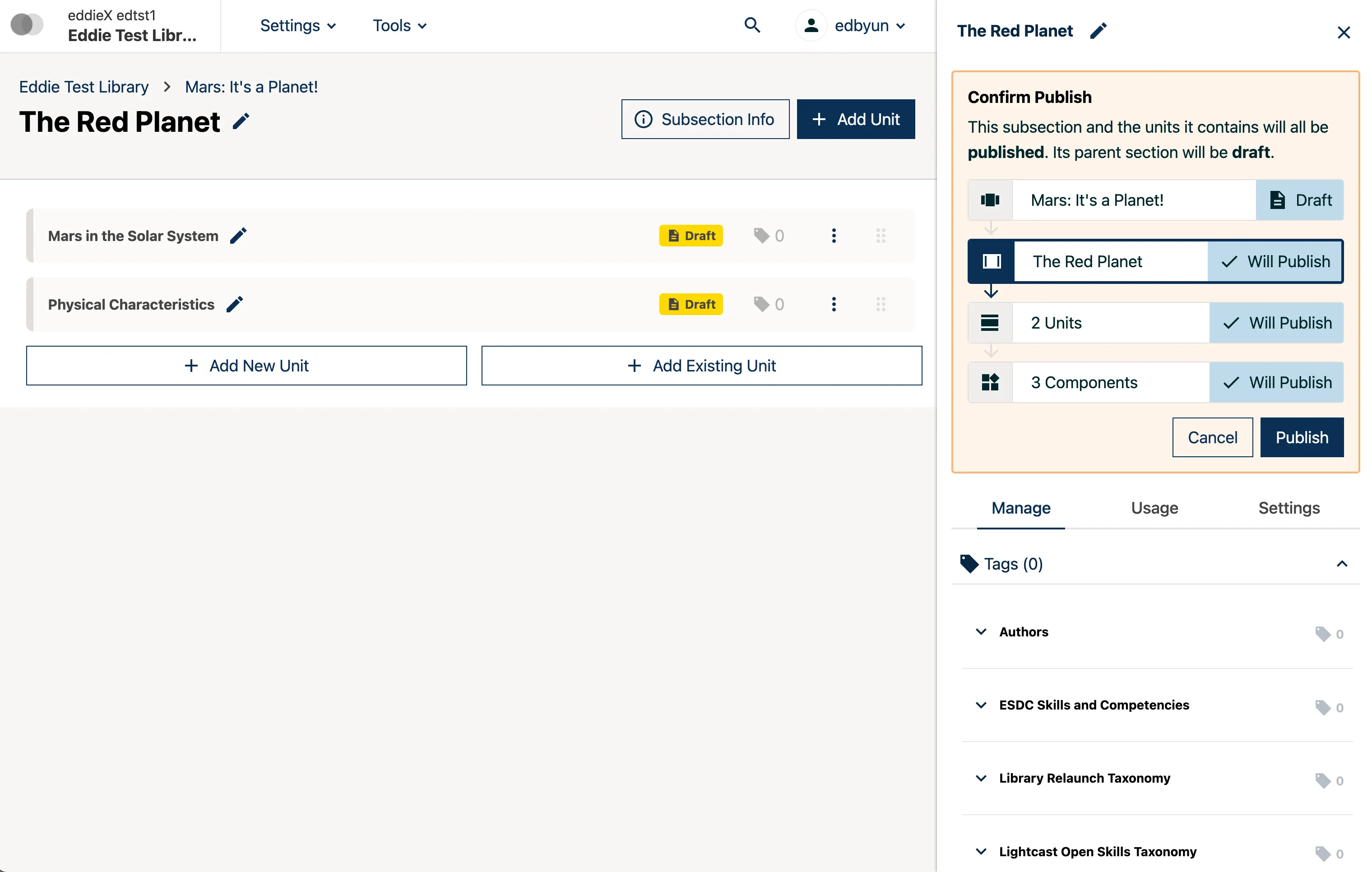 Newly created content or edits can be published via the new publish flow. Publishes to structural blocks will publish all contained content. For example, this means publishing a subsection will also publish all the units and content blocks contained within that subsection.