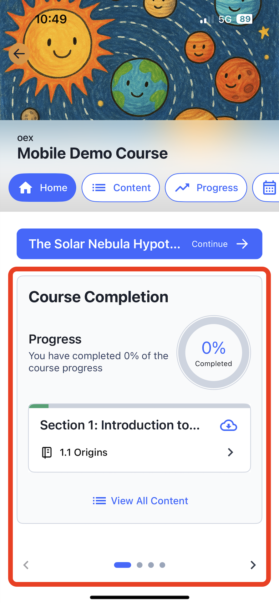 The course home has been redesigned. It now contains an area called the Course Home Carousel that serve as a progress and re-entry point for learners. The Carousel is highlighted in red below.