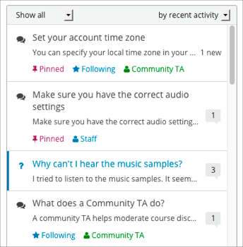 In addition to these visual cues, filters can help you find questions and discussions that need review. In the discussion navigation pane on the Discussion page, you can also select the following options from the Show all drop-down menu.