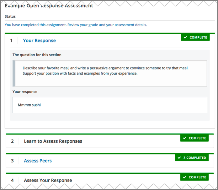 In open response assessments (ORA), learners submit essay responses and then go through a series of assessment steps (such as peer assessment and self assessment) to complete the assignment.