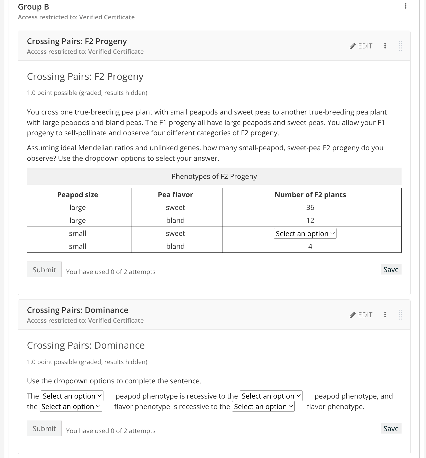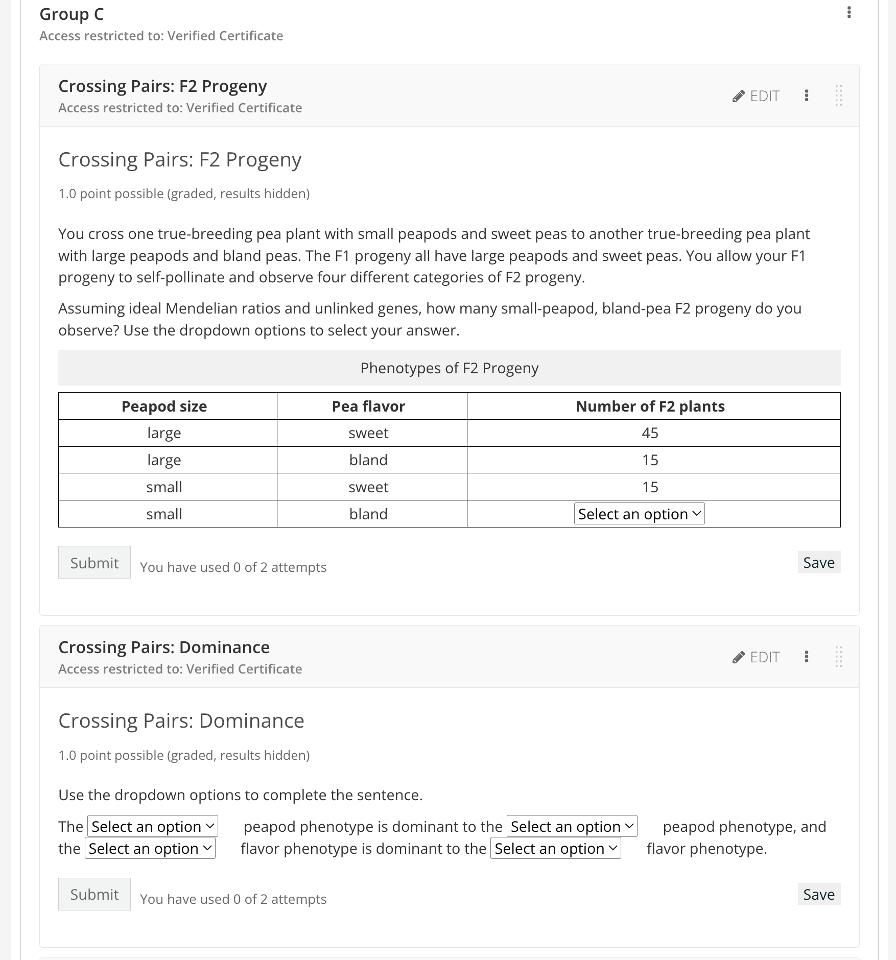 Keep the overall structure and number of problems nearly identical per content group in one unit. Manipulate easy-to-change variables like a number in a calculation. For example, in biology, these variables include DNA sequence, amino acids, tables of data, etc. The following screenshots include group A, B, and C versions of the first two related genetics questions for one unit of an exam.