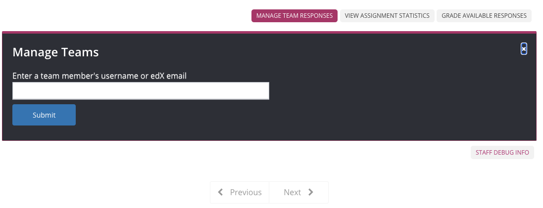 Scroll to the end of the problem where staff have a Manage Team Responses option. Select this to open the Manage Teams panel.