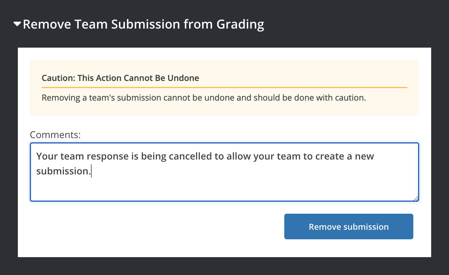 Select Remove submission. The selected submission is permanently removed from staff assessment.