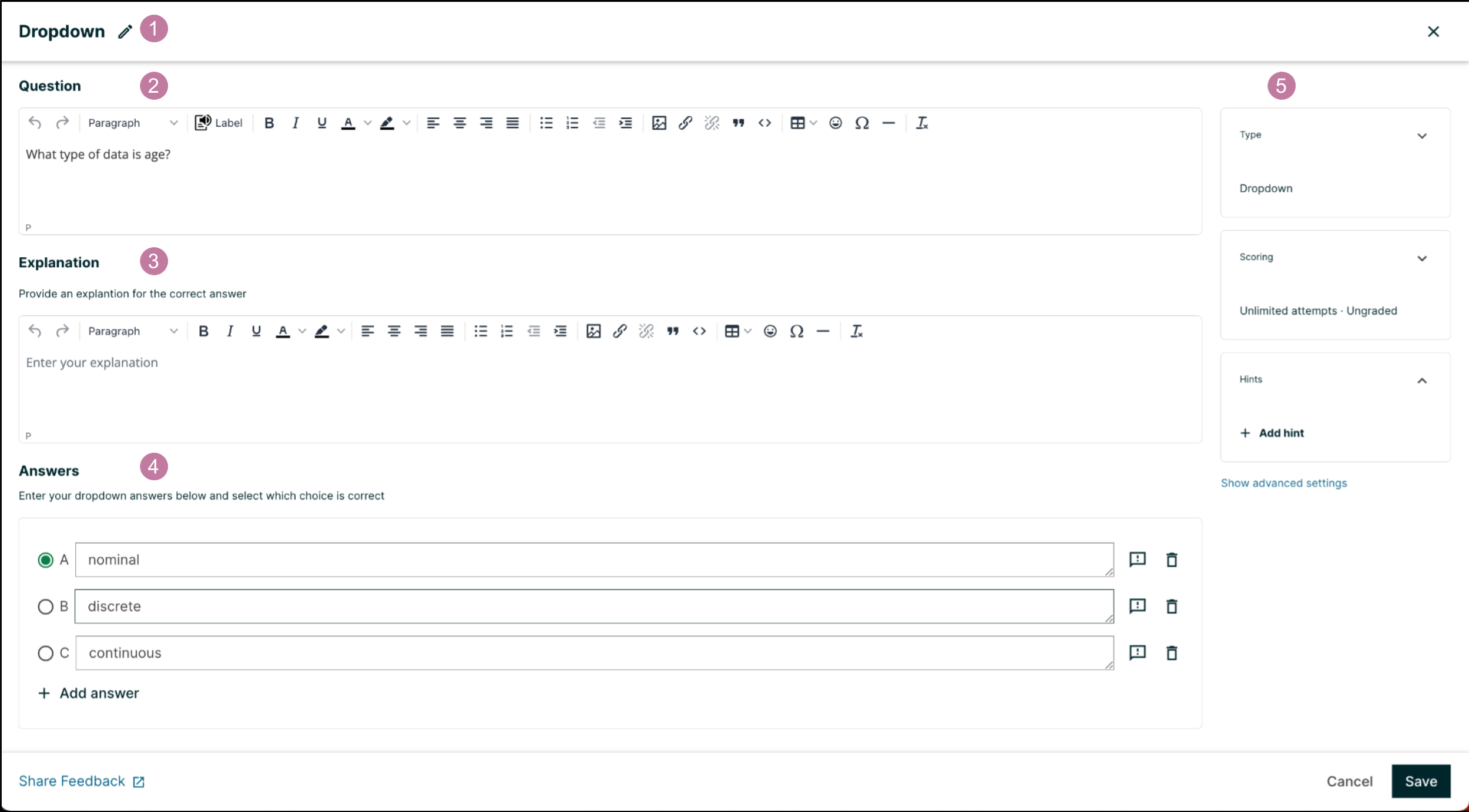Filling in the Explanation field. When this is shown to learners is based on the selection in the Show answer panel on the right.