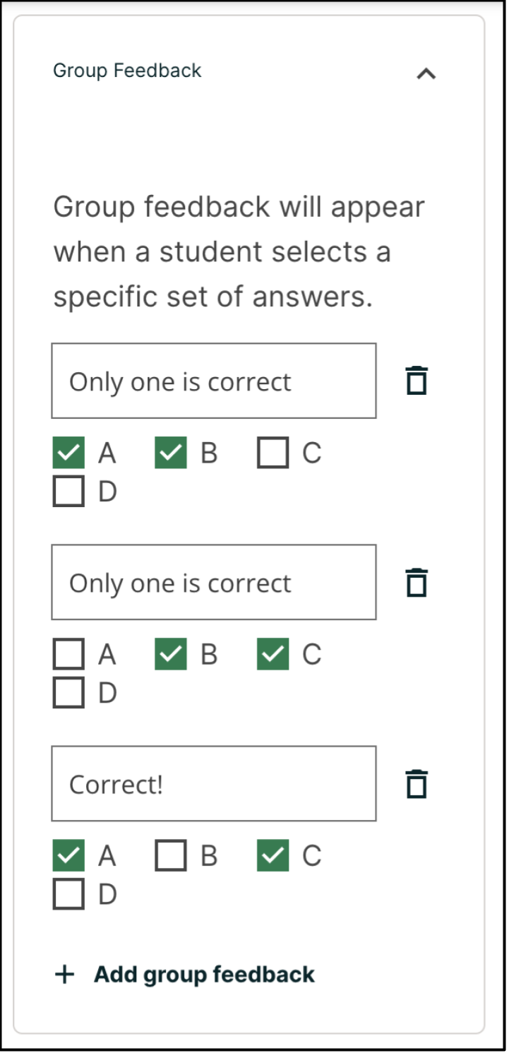 For problems with more than three answers, providing specific feedback for each combination can become difficult. For such problems, you might choose to define group feedback for more likely combinations of answers or for combinations of answers that reflect common learner misunderstandings. If you do not define feedback for a combination that a learner selects, the learner receives feedback for the individual selections.