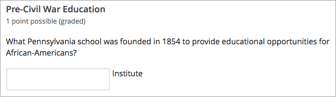 <problem> <stringresponse answer="Paris" type="ci"> . . . </stringresponse> </problem>Learners who submit an answer of either “Paris” or “paris” are scored as correct.