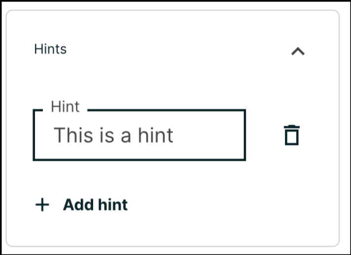 Click the Add hint button to add a new hint text field. To delete any hints you’ve added, click the trash can icon next to its respective hint field.