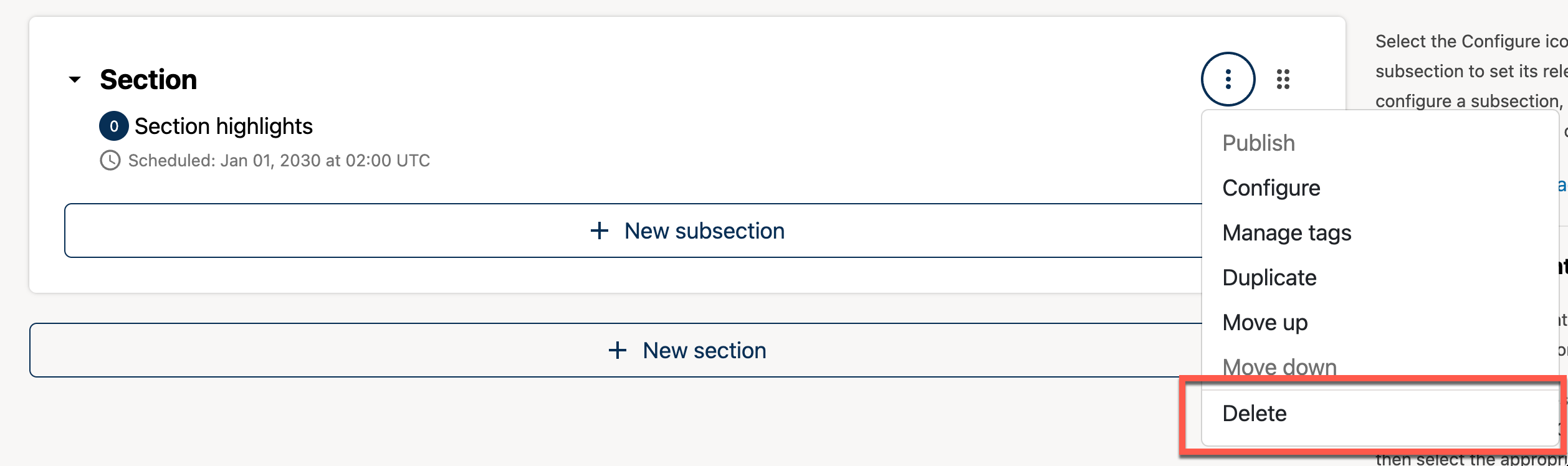Select the Configure option from the kebab menu in the section box.