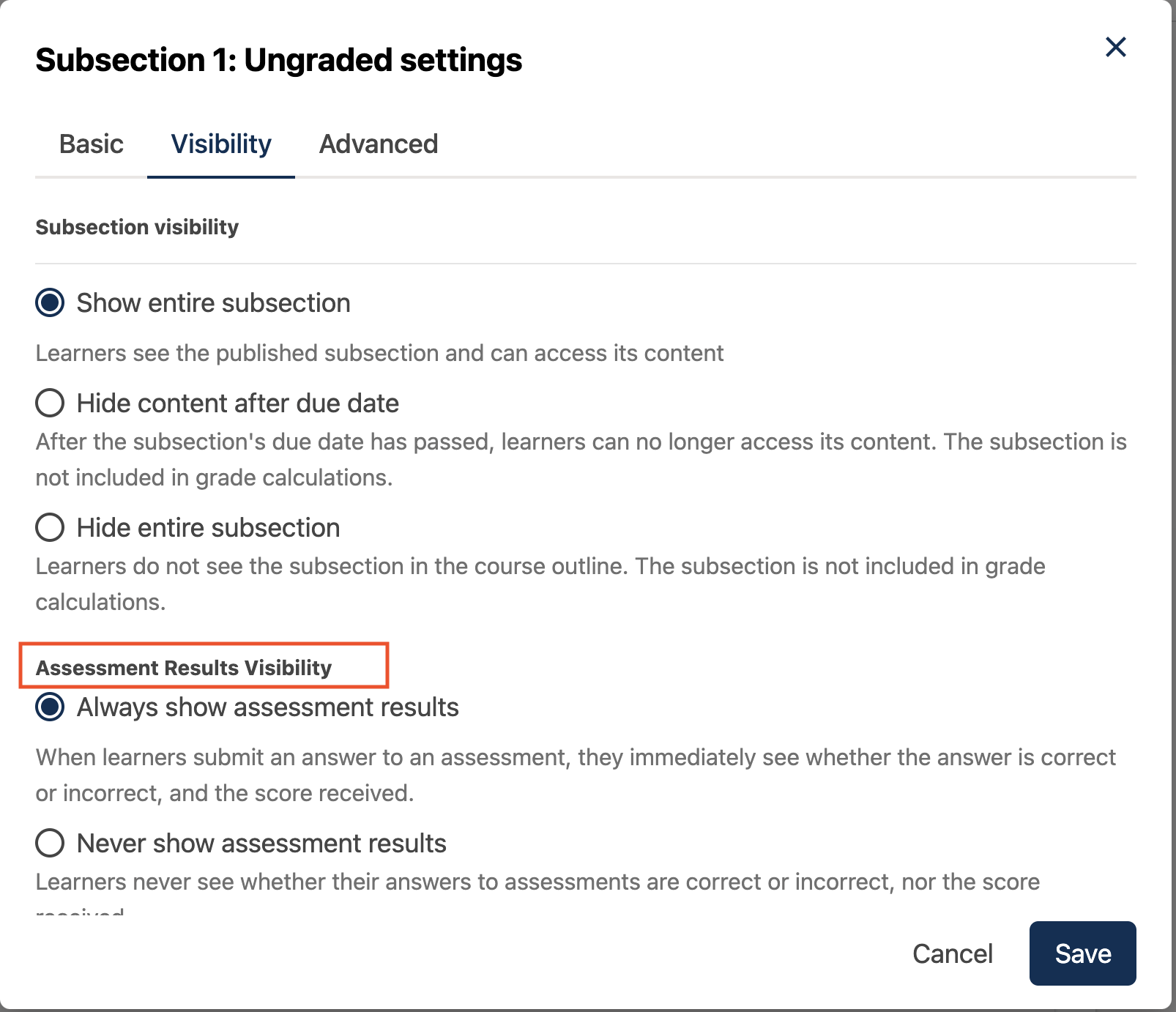 Show assessment results when subsection is past due: For learners, results are not visible until the subsection due date (for instructor-paced courses) or the course end date (for self-paced courses) has passed. For course staff, results are always visible unless the staff member is previewing or viewing the course as a learner.