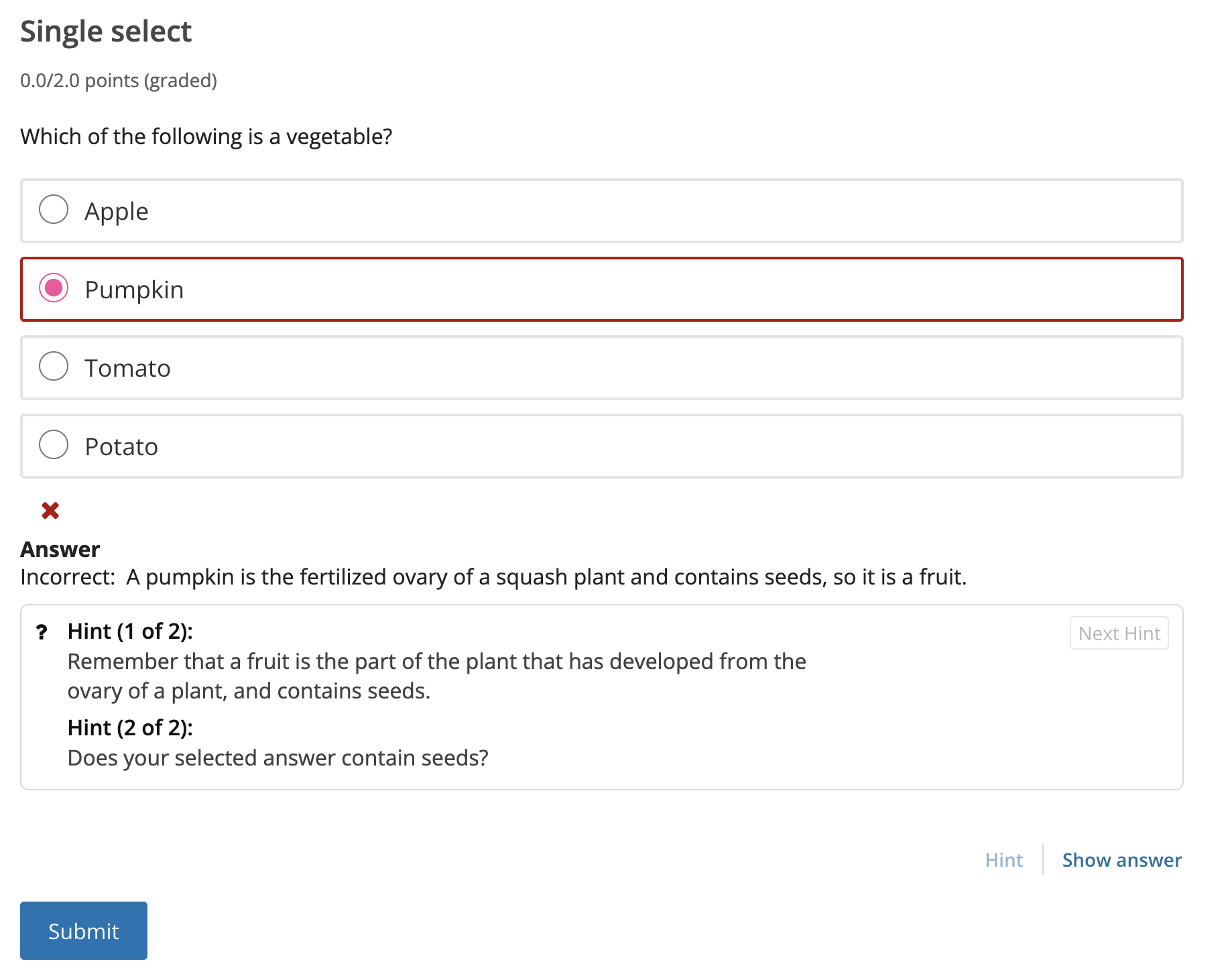 For example, the following single select problem provides feedback in response to the selected option when the learner selects Submit. In this case, feedback is given for an incorrect answer.