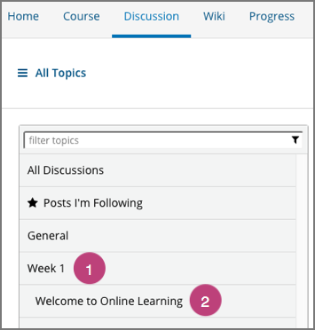 Content-specific topics you add using discussion components are included on the course Discussion page in the same way as course-wide discussion topics as included. In the following example, the category (1) and the subcategory (2) of the discussion component is shown in the list of discussion topics.
