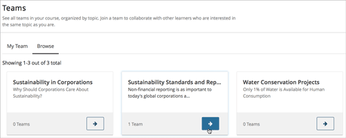In some courses, you might be assigned activities or projects that require working in small groups, or teams. Course staff will create topics that you can choose from. You choose a topic that interests you, and join or form a team with other learners who have the same interest to work on the group activity or project together. You can join only one team in your course.